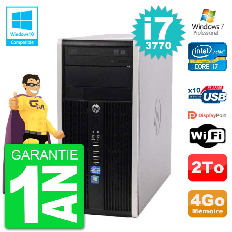 PC HP Pro 6300 format MT - Intel Core i7-3770 3.4 Ghz (8 Mo) - 4 Go DDR3 - Disque Dur 3,5" 2 To - Graveur DVD - Clé WIFI USB - Windows 7 Pro - Garantie 1 an.