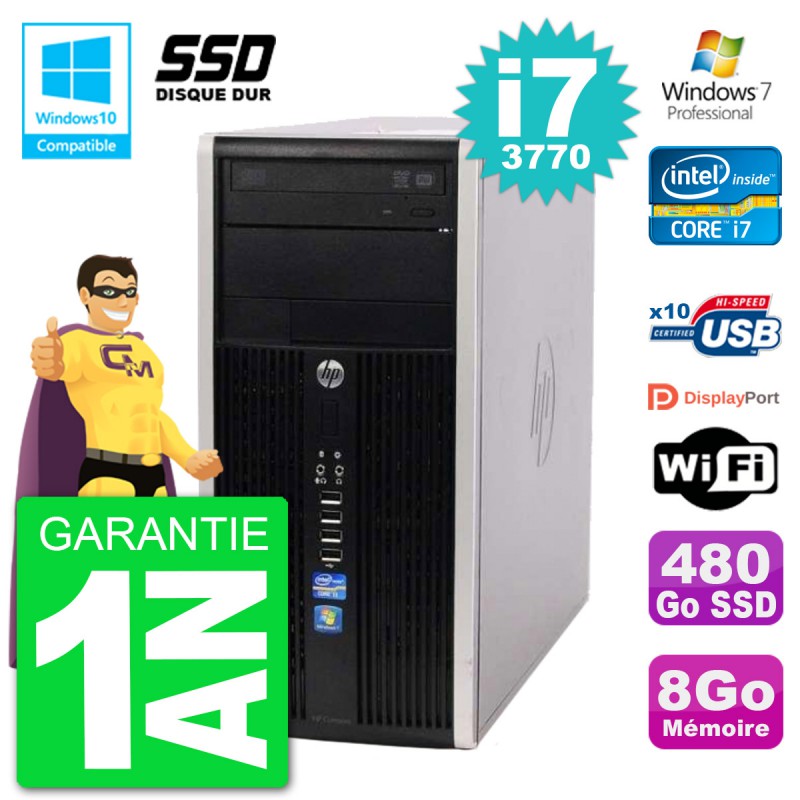 PC HP 6300 MT Intel Core i7-3770 RAM 8Go SSD 480Go Graveur DVD Wifi W7