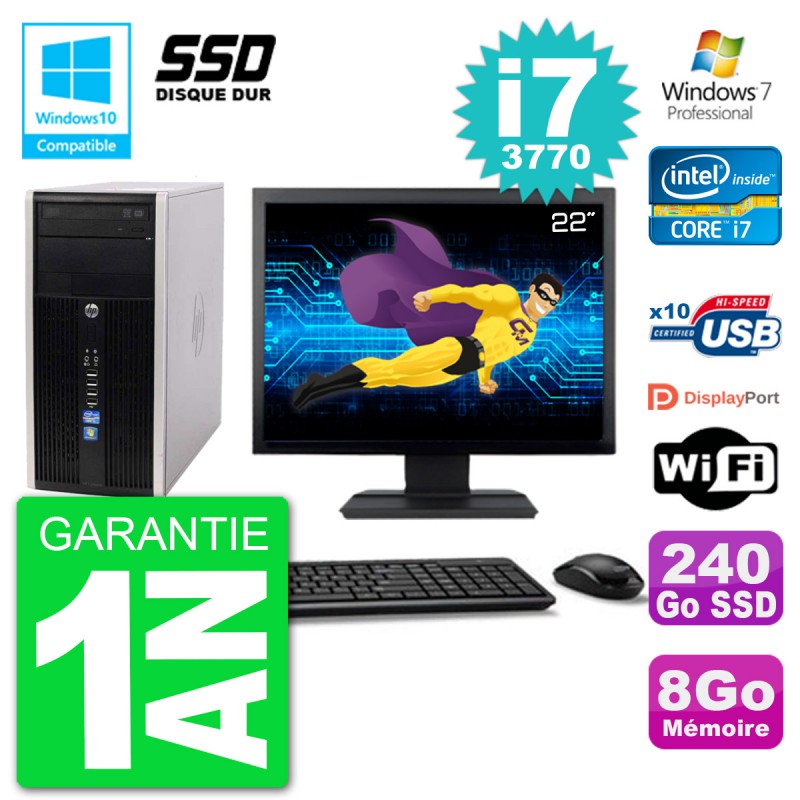 PC HP 6300 MT Ecran 22" Core i7-3770 RAM 8Go SSD 240Go Graveur DVD Wifi W7
