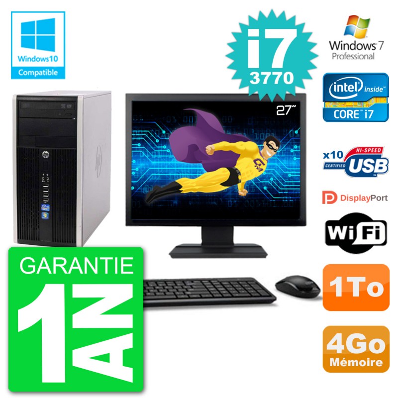PC HP 6300 MT Ecran 27" Core i7-3770 RAM 4Go Disque 1To Graveur DVD Wifi W7