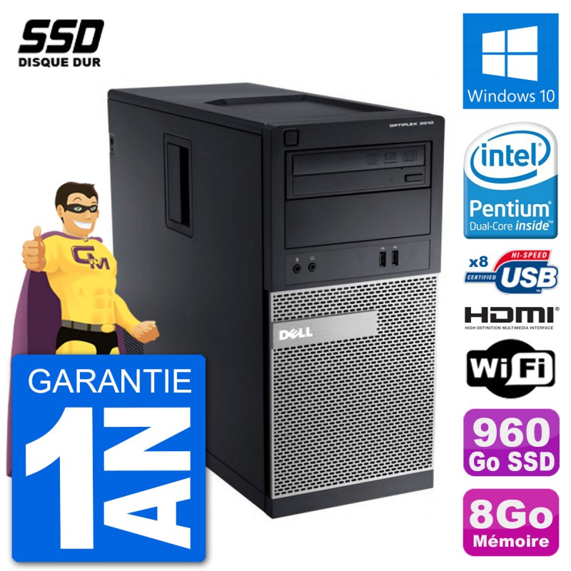 PC Dell OptiPlex 3010 MT - Intel Pentium Dual-Core G2020 2.9 Ghz (3 Mo) - 8 Go DDR3 - Disque Dur SSD 960 Go - Graveur DVD - Clef Wifi USB - Windows 10 - Garantie 1 an.