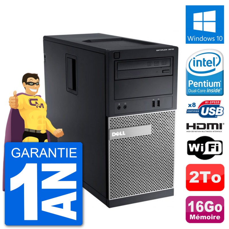 PC Dell OptiPlex 3010 MT - Intel Pentium Dual-Core G2020 2.9 Ghz (3 Mo) - 16 Go DDR3 - Disque Dur 3,5" 2 To - Graveur DVD - Clef Wifi USB - Windows 10 - Garantie 1 an.