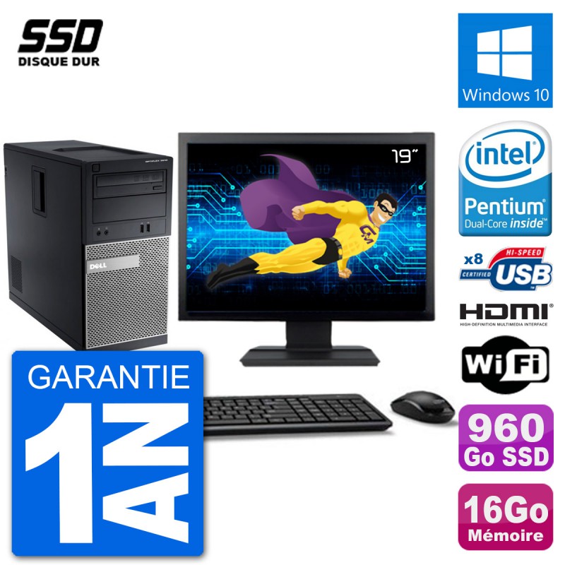 PC Dell 3010 MT - Intel Pentium Dual-Core G2020 2.9 Ghz (3 Mo) - 16 Go DDR3 - Disque Dur SSD 960 Go - Graveur DVD - Clef Wifi USB - Windows 10 - Livré avec Ecran 19" + clavier + souris (Marques et modèles variables) - Garantie 1 an.
