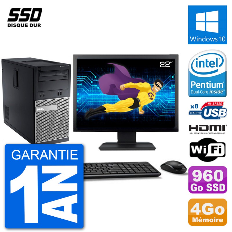 PC Dell 3010 MT - Intel Pentium Dual-Core G2020 2.9 Ghz (3 Mo) - 4 Go DDR3 - Disque Dur SSD 960 Go - Graveur DVD - Clef Wifi USB - Windows 10 - Livré avec Ecran 22" + clavier + souris (Marques et modèles variables) - Garantie 1 an.