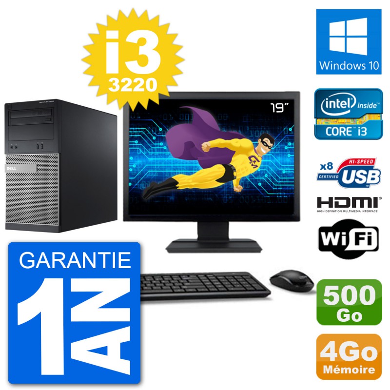 PC Dell 3010 MT - Intel Core i3-3220 3.3 Ghz (3 Mo) - 4 Go DDR3 - Disque Dur 3,5" 500 Go - Graveur DVD - Clef Wifi USB - Windows 10 - Livré avec Ecran 19" + clavier + souris (Marques et modèles variables) - Garantie 1 an.