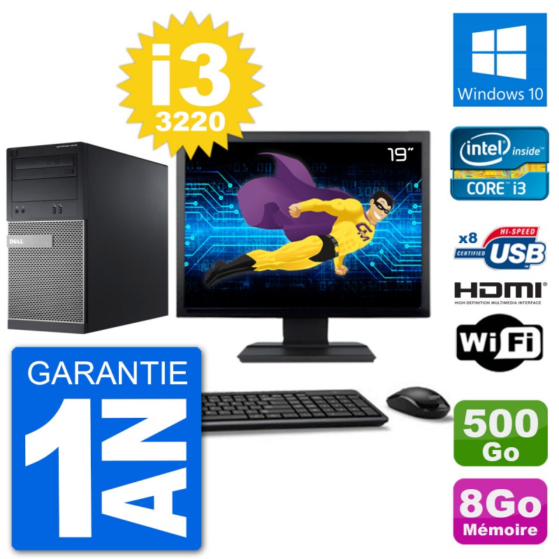 PC Dell 3010 MT - Intel Core i3-3220 3.3 Ghz (3 Mo) - 8 Go DDR3 - Disque Dur 3,5" 500 Go - Graveur DVD - Clef Wifi USB - Windows 10 - Livré avec Ecran 19" + clavier + souris (Marques et modèles variables) - Garantie 1 an.