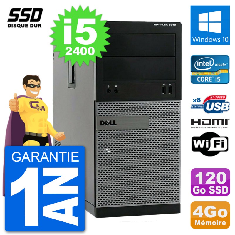PC Dell OptiPlex 3010 MT - Intel Core i5-2400 3.1 Ghz (6 Mo) - 4 Go DDR3 - Disque Dur SSD 120 Go - Graveur DVD - Clef Wifi USB - Windows 10 - Garantie 1 an.