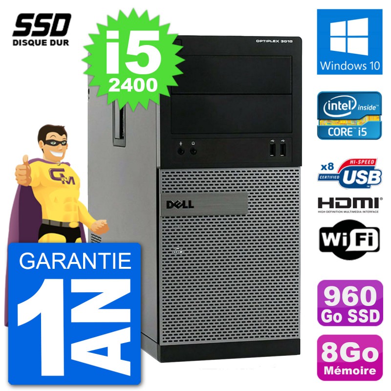 PC Dell OptiPlex 3010 MT - Intel Core i5-2400 3.1 Ghz (6 Mo) - 8 Go DDR3 - Disque Dur SSD 960 Go - Graveur DVD - Clef Wifi USB - Windows 10 - Garantie 1 an.