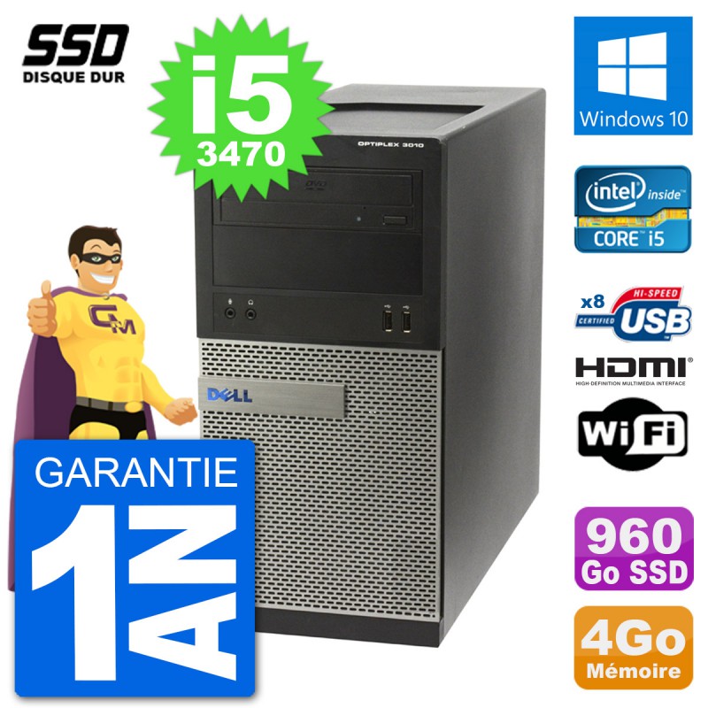 PC Dell OptiPlex 3010 MT - Intel Core i5-3470 3.2 Ghz (6 Mo) - 4 Go DDR3 - Disque Dur SSD 960 Go - Graveur DVD - Clef Wifi USB - Windows 10 - Garantie 1 an.