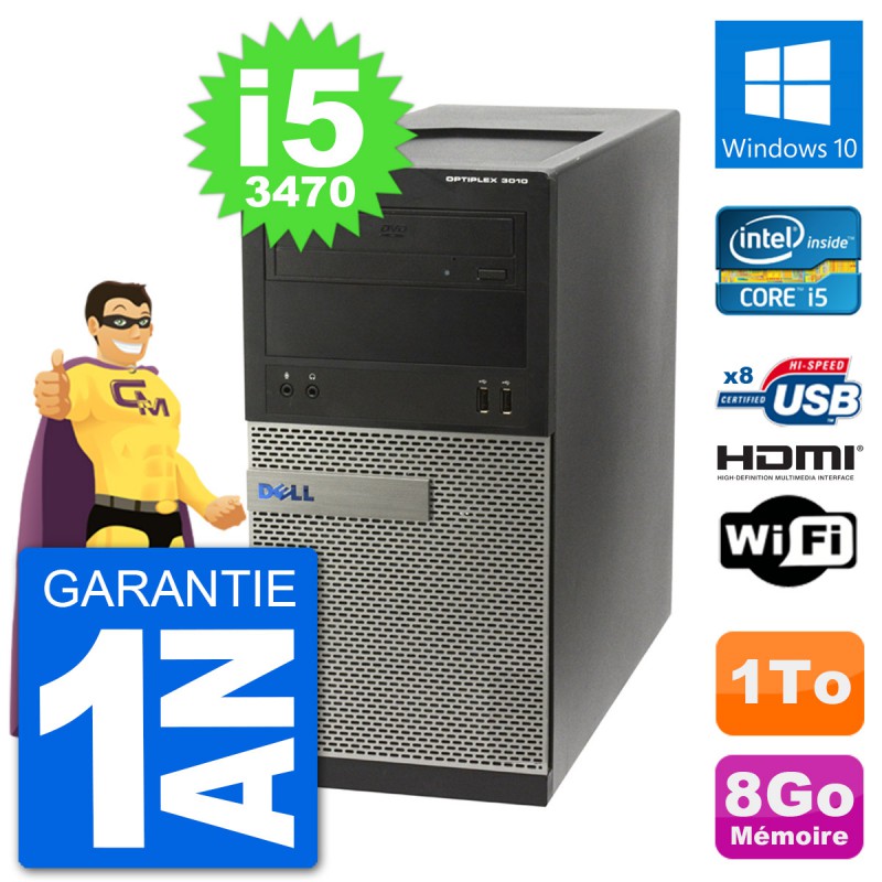PC Dell OptiPlex 3010 MT - Intel Core i5-3470 3.2 Ghz (6 Mo) - 8 Go DDR3 - Disque Dur 3,5" 1 To - Graveur DVD - Clef Wifi USB - Windows 10 - Garantie 1 an.