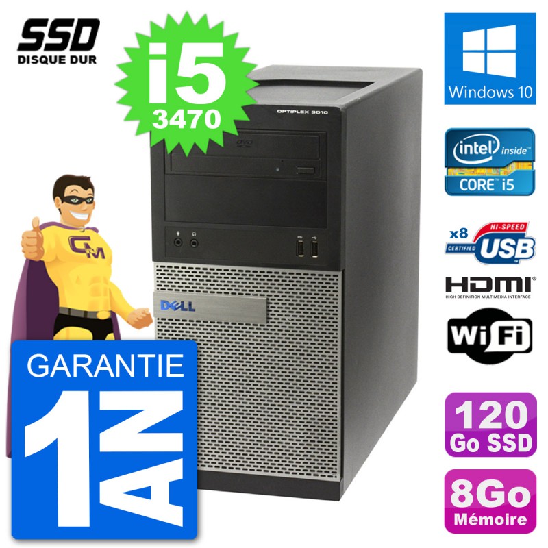 PC Dell OptiPlex 3010 MT - Intel Core i5-3470 3.2 Ghz (6 Mo) - 8 Go DDR3 - Disque Dur SSD 120 Go - Graveur DVD - Clef Wifi USB - Windows 10 - Garantie 1 an.