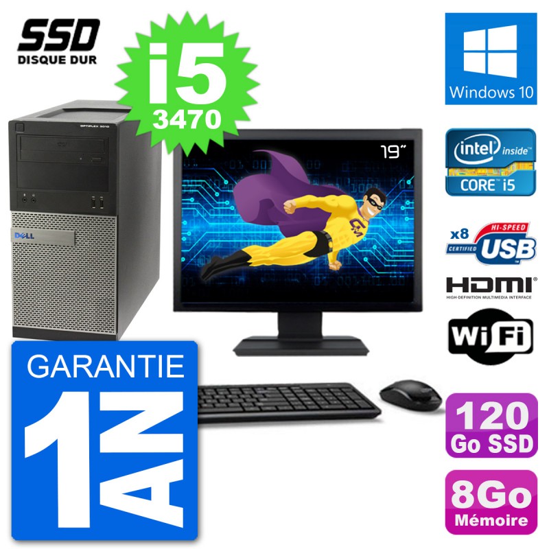 PC Dell 3010 MT - Intel Core i5-3470 3.2 Ghz (6 Mo) - 8 Go DDR3 - Disque Dur SSD 120 Go - Graveur DVD - Clef Wifi USB - Windows 10 - Livré avec Ecran 19" + clavier + souris (Marques et modèles variables) - Garantie 1 an.