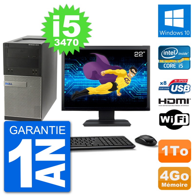 PC Dell 3010 MT - Intel Core i5-3470 3.2 Ghz (6 Mo) - 4 Go DDR3 - Disque Dur 3,5" 1 To - Graveur DVD - Clef Wifi USB - Windows 10 - Livré avec Ecran 22" + clavier + souris (Marques et modèles variables) - Garantie 1 an.