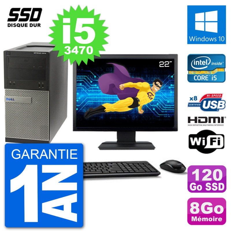 PC Dell 3010 MT - Intel Core i5-3470 3.2 Ghz (6 Mo) - 8 Go DDR3 - Disque Dur SSD 120 Go - Graveur DVD - Clef Wifi USB - Windows 10 - Livré avec Ecran 22" + clavier + souris (Marques et modèles variables) - Garantie 1 an.