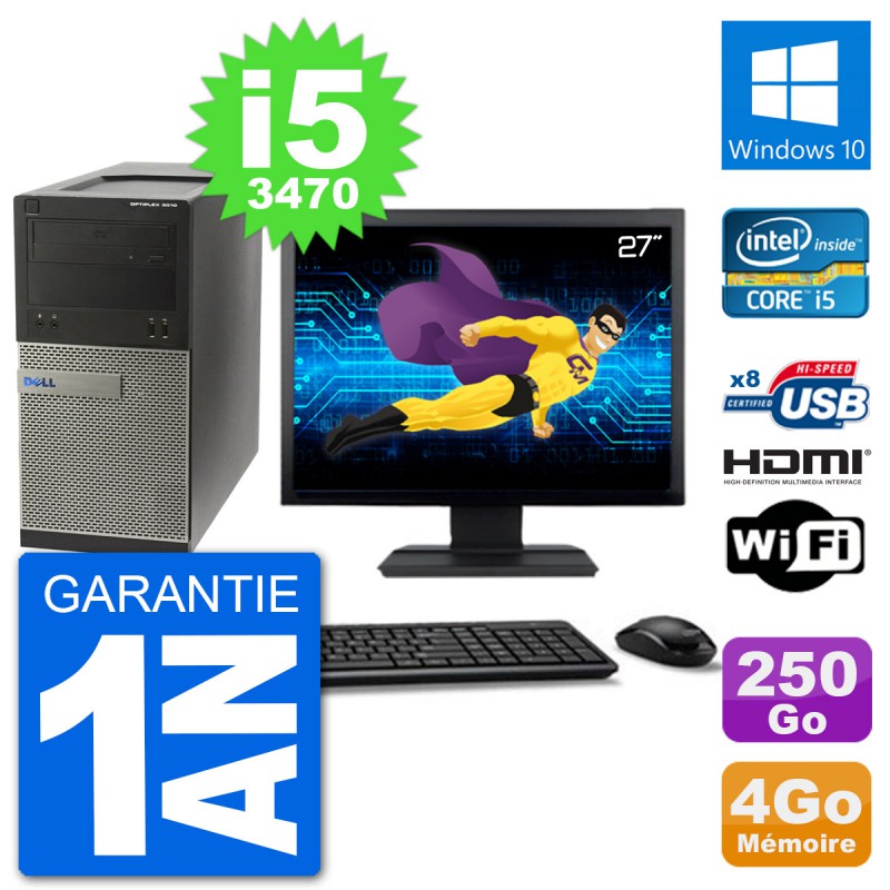 PC Dell 3010 MT - Intel Core i5-3470 3.2 Ghz (6 Mo) - 4 Go DDR3 - Disque Dur 3,5" 250 Go - Graveur DVD - Clef Wifi USB - Windows 10 - Livré avec Ecran 27" + clavier + souris (Marques et modèles variables) - Garantie 1 an.