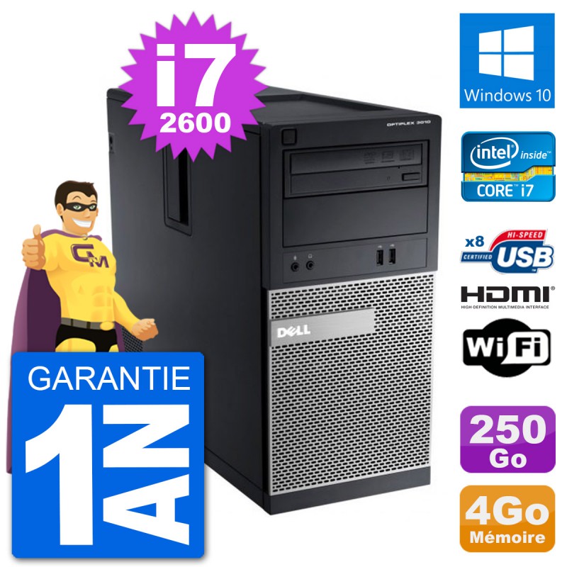 PC Dell OptiPlex 3010 MT - Intel Core i7-2600 3.4 Ghz (8 Mo) - 4 Go DDR3 - Disque Dur 3,5" 250 Go - Graveur DVD - Clef Wifi USB - Windows 10 - Garantie 1 an.