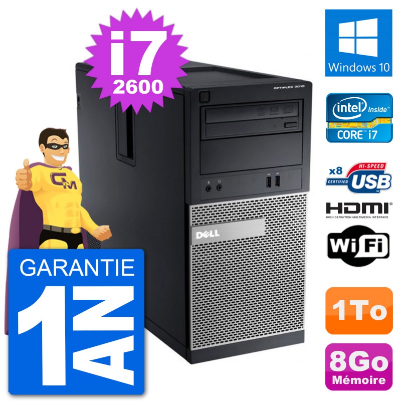 PC Dell OptiPlex 3010 MT - Intel Core i7-2600 3.4 Ghz (8 Mo) - 8 Go DDR3 - Disque Dur 3,5" 1 To - Graveur DVD - Clef Wifi USB - Windows 10 - Garantie 1 an.