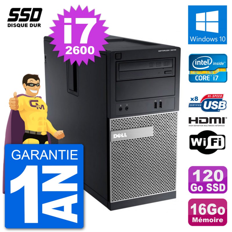 PC Dell OptiPlex 3010 MT - Intel Core i7-2600 3.4 Ghz (8 Mo) - 16 Go DDR3 - Disque Dur SSD 120 Go - Graveur DVD - Clef Wifi USB - Windows 10 - Garantie 1 an.