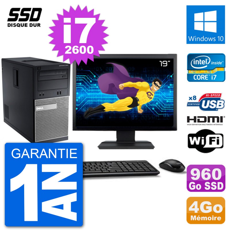 PC Dell 3010 MT - Intel Core i7-2600 3.4 Ghz (8 Mo) - 4 Go DDR3 - Disque Dur SSD 960 Go - Graveur DVD - Clef Wifi USB - Windows 10 - Livré avec Ecran 19" + clavier + souris (Marques et modèles variables) - Garantie 1 an.