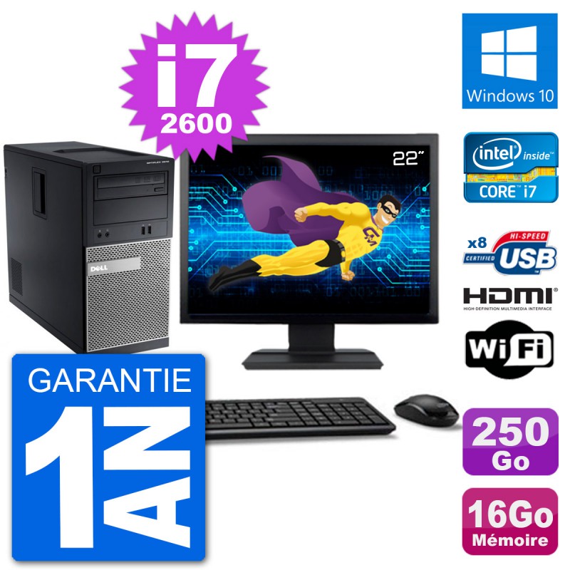 PC Dell 3010 MT - Intel Core i7-2600 3.4 Ghz (8 Mo) - 16 Go DDR3 - Disque Dur 3,5" 250 Go - Graveur DVD - Clef Wifi USB - Windows 10 - Livré avec Ecran 22" + clavier + souris (Marques et modèles variables) - Garantie 1 an.