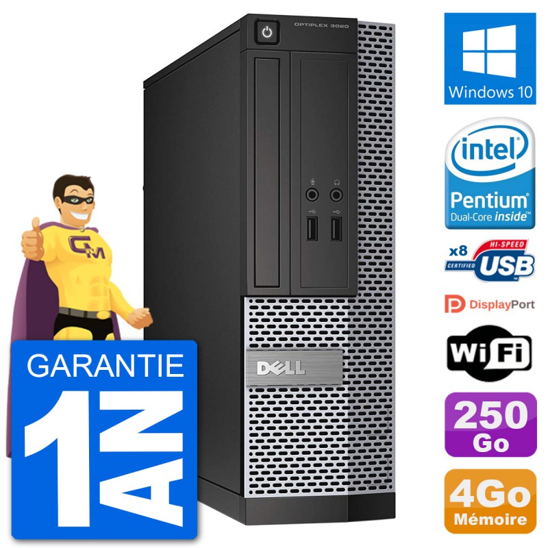 PC Dell OptiPlex 3020 SFF - Intel Pentium G3220 3.0 Ghz (3 Mo) - 4 Go DDR3 - Disque Dur 3,5" 250 Go - Graveur DVD - Clef Wifi USB - Windows 10 - Garantie 1 an.