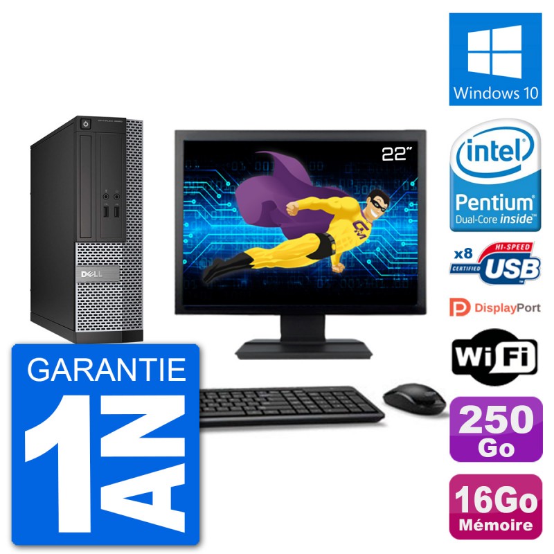 PC Dell 3020 SFF - Intel Pentium G3220 3.0 Ghz (3 Mo) - 16 Go DDR3 - Disque Dur 3,5" 250 Go - Graveur DVD - Clef Wifi USB - Windows 10 - Livré avec Ecran 22" + clavier + souris (Marques et modèles variables) - Garantie 1 an.