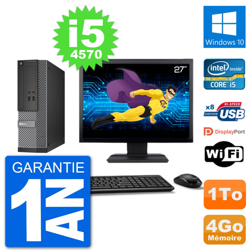 PC Dell 3020 SFF - Intel Core i5-4570 3.2 Ghz (6 Mo) - 4 Go DDR3 - Disque Dur 3,5" 1 To - Graveur DVD - Clef Wifi USB - Windows 10 - Livré avec Ecran 27" + clavier + souris (Marques et modèles variables) - Garantie 1 an.