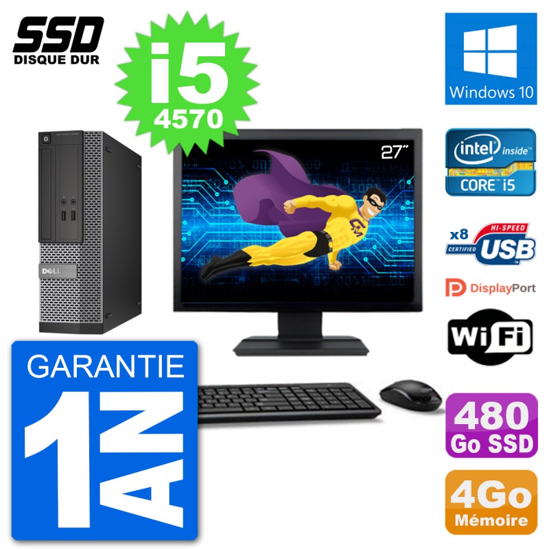 PC Dell 3020 SFF - Intel Core i5-4570 3.2 Ghz (6 Mo) - 4 Go DDR3 - Disque Dur SSD 480 Go - Graveur DVD - Clef Wifi USB - Windows 10 - Livré avec Ecran 27" + clavier + souris (Marques et modèles variables) - Garantie 1 an.