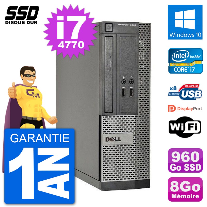 PC Dell OptiPlex 3020 SFF - Intel Core i7-4770 3.4 Ghz (8 Mo) - 8 Go DDR3 - Disque Dur SSD 960 Go - Graveur DVD - Clef Wifi USB - Windows 10 - Garantie 1 an.