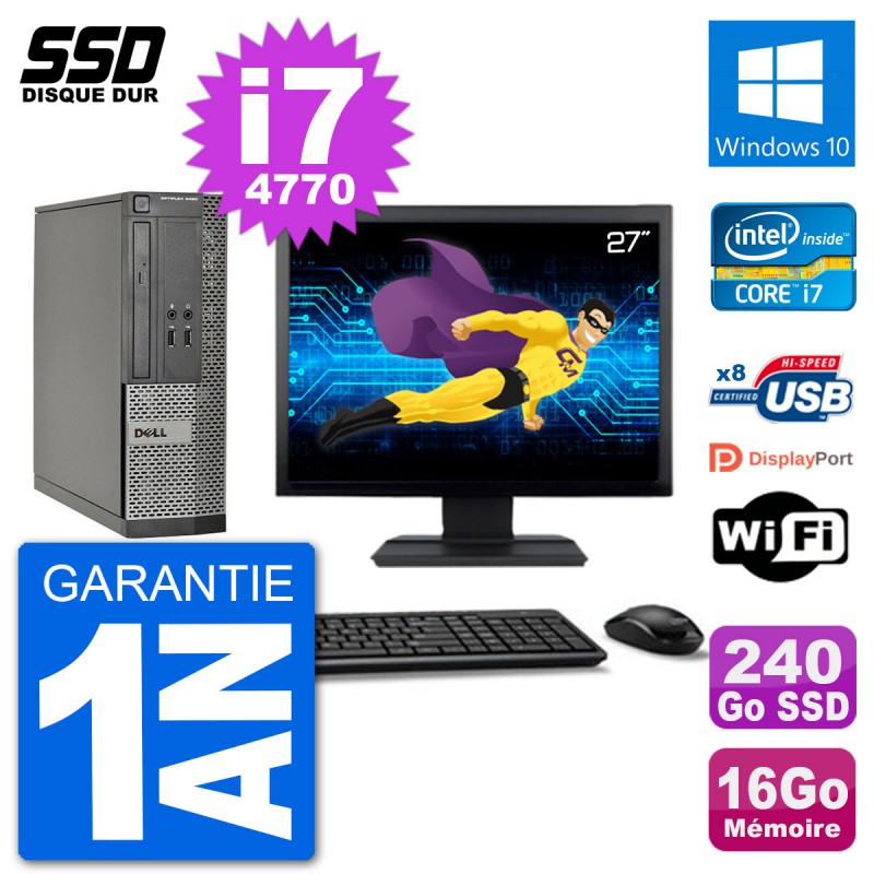PC Dell 3020 SFF - Intel Core i7-4770 3.4 Ghz (8 Mo) - 16 Go DDR3 - Disque Dur SSD 240 Go - Graveur DVD - Clef Wifi USB - Windows 10 - Livré avec Ecran 27" + clavier + souris (Marques et modèles variables) - Garantie 1 an.