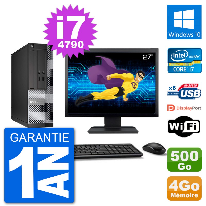 PC Dell 3020 SFF - Intel Core i7-4790 3.6 Ghz (8 Mo) - 4 Go DDR3 - Disque Dur 3,5" 500 Go - Graveur DVD - Clef Wifi USB - Windows 10 - Livré avec Ecran 27" + clavier + souris (Marques et modèles variables) - Garantie 1 an.