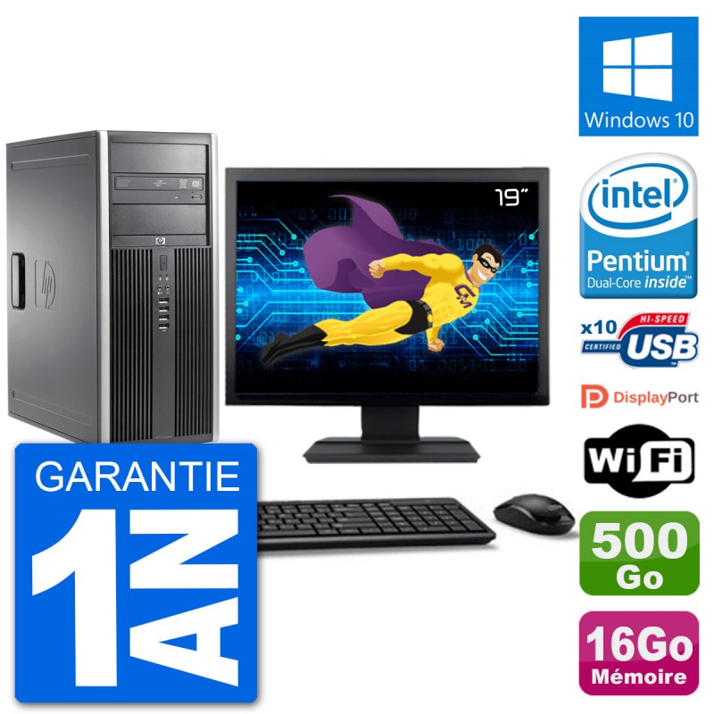 PC Tour HP 8200 Elite - Intel Pentium Dual-Core G630 2.7 Ghz (3 Mo) - 16 Go DDR3 - Disque Dur 3,5" 500 Go - Graveur DVD - Clef Wifi USB - Windows 10 - Livré avec Ecran 19" + clavier + souris (Marques et modèles variables) - Garantie 1 an.