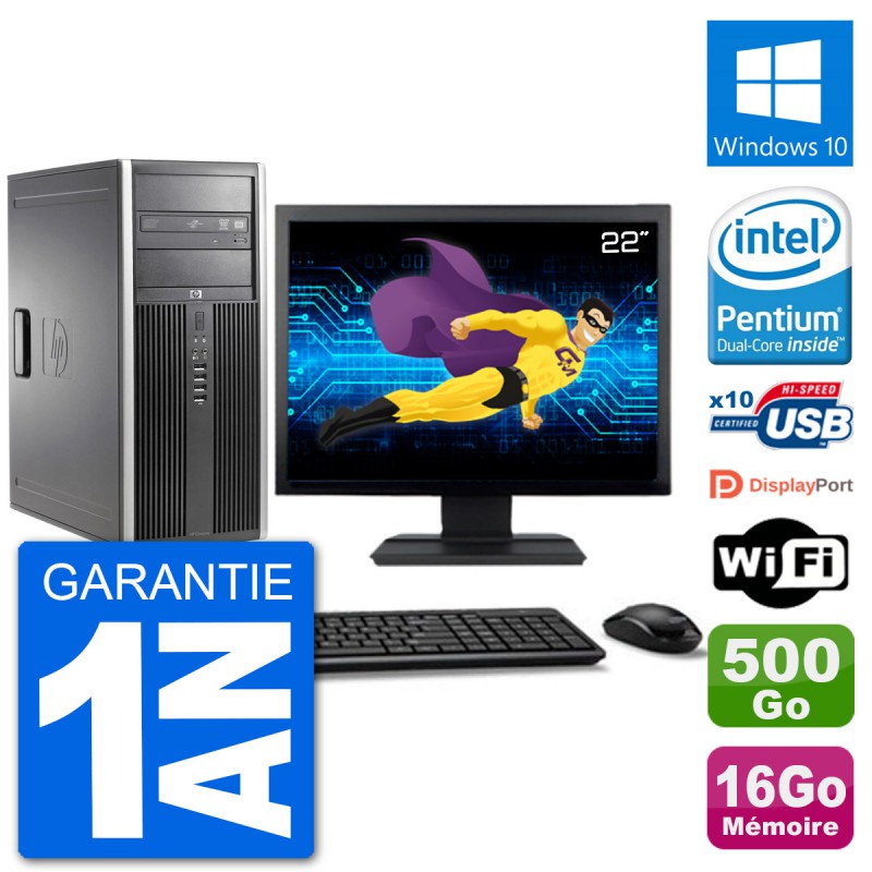PC Tour HP 8200 Elite - Intel Pentium Dual-Core G630 2.7 Ghz (3 Mo) - 16 Go DDR3 - Disque Dur 3,5" 500 Go - Graveur DVD - Clef Wifi USB - Windows 10 - Livré avec Ecran 22" + clavier + souris (Marques et modèles variables) - Garantie 1 an.