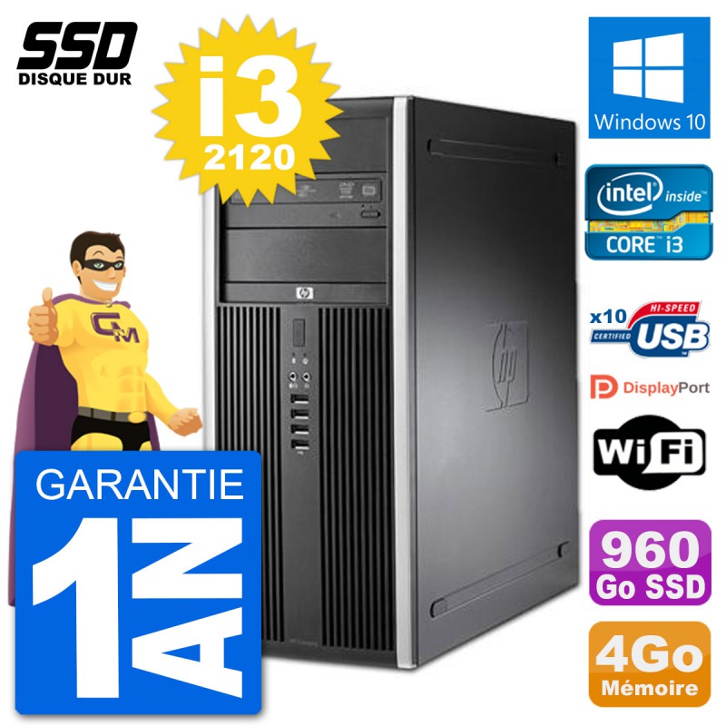 PC Tour HP 8200 Elite - Intel Core i3-2120 3.3 Ghz (3 Mo) - 4 Go DDR3 - Disque Dur SSD 960 Go - Graveur DVD - Clef Wifi USB - Windows 10 - Garantie 1 an.
