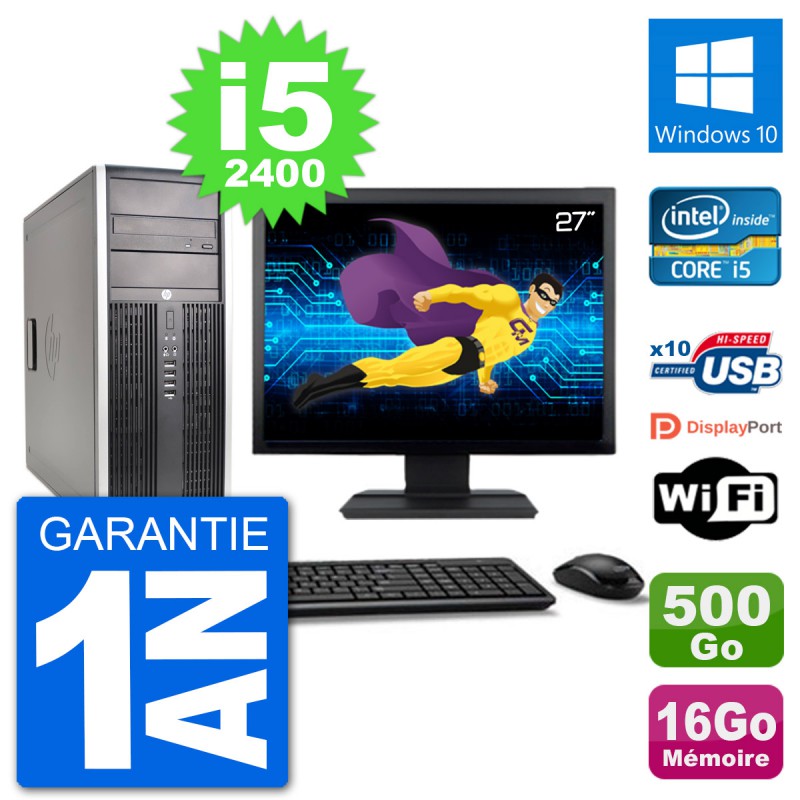 PC Tour HP 8200 Elite - Intel Core i5-2400 3.1 Ghz (6 Mo) - 16 Go DDR3 - Disque Dur 3,5" 500 Go - Graveur DVD - Clef Wifi USB - Windows 10 - Livré avec Ecran 27" + clavier + souris (Marques et modèles variables) - Garantie 1 an.