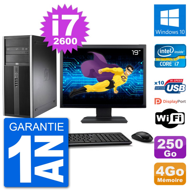 PC Tour HP 8200 Elite - Intel Core i7-2600 3.4 Ghz (8 Mo) - 4 Go DDR3 - Disque Dur 3,5" 250 Go - Graveur DVD - Clef Wifi USB - Windows 10 - Livré avec Ecran 19" + clavier + souris (Marques et modèles variables) - Garantie 1 an.