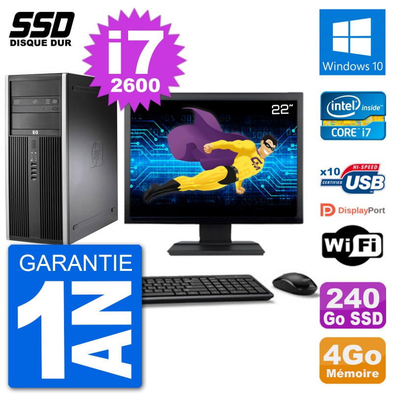 PC Tour HP 8200 Elite - Intel Core i7-2600 3.4 Ghz (8 Mo) - 4 Go DDR3 - Disque Dur SSD 240 Go - Graveur DVD - Clef Wifi USB - Windows 10 - Livré avec Ecran 22" + clavier + souris (Marques et modèles variables) - Garantie 1 an.