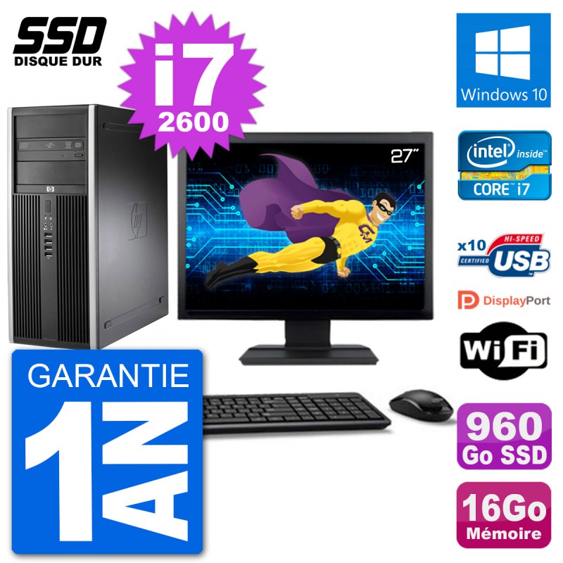 PC Tour HP 8200 Elite - Intel Core i7-2600 3.4 Ghz (8 Mo) - 16 Go DDR3 - Disque Dur SSD 960 Go - Graveur DVD - Clef Wifi USB - Windows 10 - Livré avec Ecran 27" + clavier + souris (Marques et modèles variables) - Garantie 1 an.