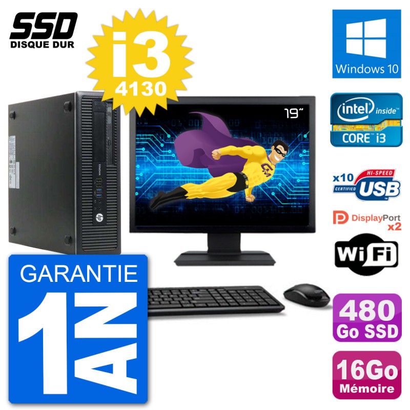 PC HP EliteDesk 800 G1 Ecran 19" Core i3-4130 RAM 16Go SSD 480Go Windows 10 Wifi