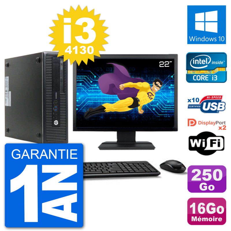 PC HP EliteDesk 800 G1 SFF - Intel Core i3-4130 3.4 Ghz (3 Mo) - 16 Go DDR3 - Disque Dur 3,5" 250 Go - Graveur DVD - Clef Wifi USB - Windows 10 - Livré avec Ecran 22" + clavier + souris (Marques et modèles variables) - Garantie 1 an.