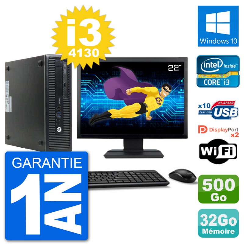 PC HP EliteDesk 800 G1 SFF - Intel Core i3-4130 3.4 Ghz (3 Mo) - 32 Go DDR3 - Disque Dur 3,5" 500 Go - Graveur DVD - Clef Wifi USB - Windows 10 - Livré avec Ecran 22" + clavier + souris (Marques et modèles variables) - Garantie 1 an.