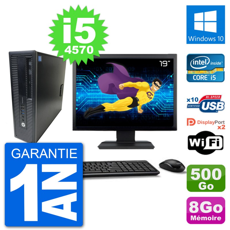 PC HP EliteDesk 800 G1 SFF - Intel Core i5-4570 3.2 Ghz (6 Mo) - 8 Go DDR3 - Disque Dur 3,5" 500 Go - Graveur DVD - Clef Wifi USB - Windows 10 - Livré avec Ecran 19" + clavier + souris (Marques et modèles variables) - Garantie 1 an.