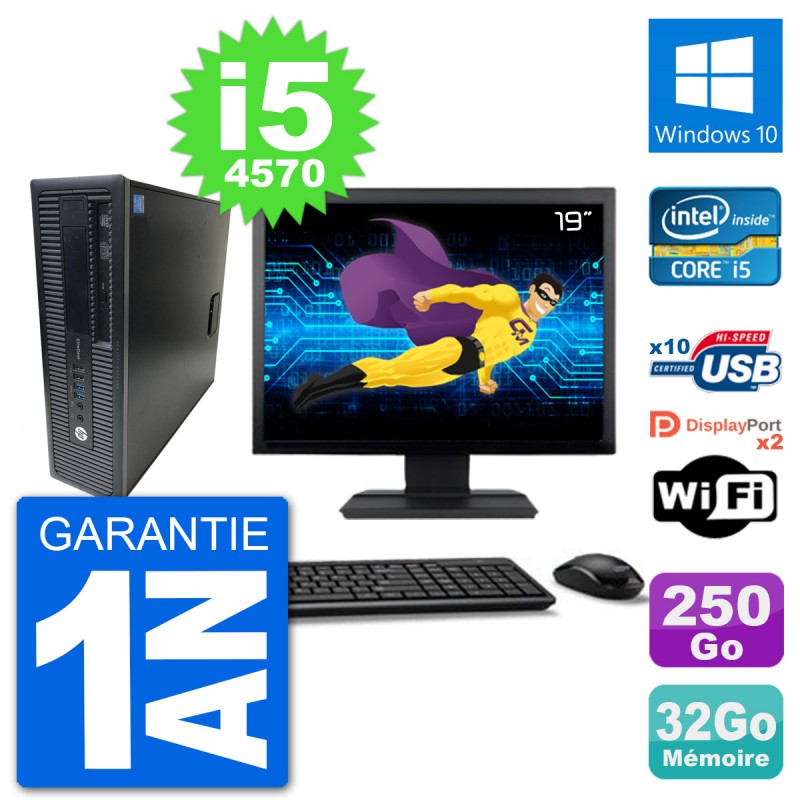 PC HP EliteDesk 800 G1 SFF - Intel Core i5-4570 3.2 Ghz (6 Mo) - 32 Go DDR3 - Disque Dur 3,5" 250 Go - Graveur DVD - Clef Wifi USB - Windows 10 - Livré avec Ecran 19" + clavier + souris (Marques et modèles variables) - Garantie 1 an.