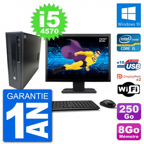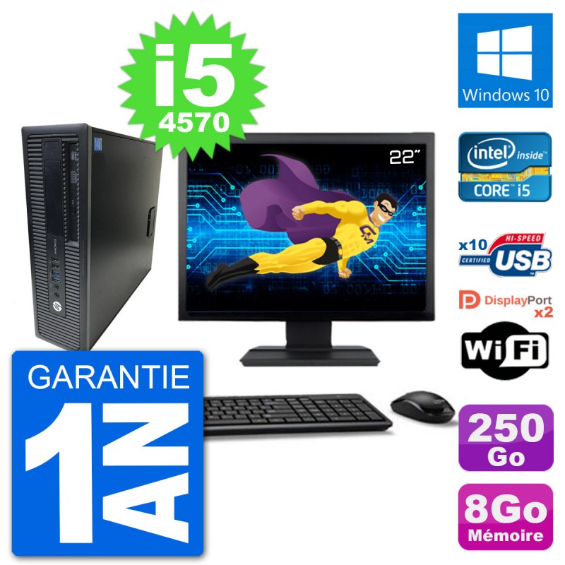 PC HP EliteDesk 800 G1 SFF - Intel Core i5-4570 3.2 Ghz (6 Mo) - 8 Go DDR3 - Disque Dur 3,5" 250 Go - Graveur DVD - Clef Wifi USB - Windows 10 - Livré avec Ecran 22" + clavier + souris (Marques et modèles variables) - Garantie 1 an.