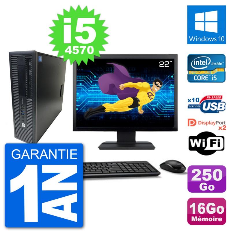 PC HP EliteDesk 800 G1 SFF - Intel Core i5-4570 3.2 Ghz (6 Mo) - 16 Go DDR3 - Disque Dur 3,5" 250 Go - Graveur DVD - Clef Wifi USB - Windows 10 - Livré avec Ecran 22" + clavier + souris (Marques et modèles variables) - Garantie 1 an.