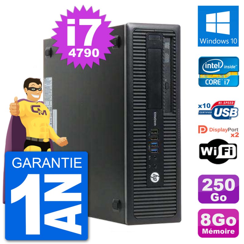 PC HP EliteDesk 800 G1 SFF - Intel Core i7-4790 3.6 Ghz (8 Mo) - 8 Go DDR3 - Disque Dur 3,5" 250 Go - Graveur DVD - Clef Wifi USB - Windows 10 - Garantie 1 an.