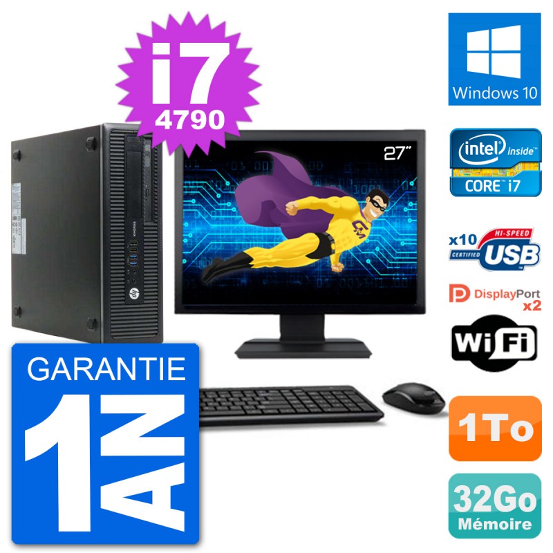 PC HP EliteDesk 800 G1 SFF - Intel Core i7-4790 3.6 Ghz (8 Mo) - 32 Go DDR3 - Disque Dur 3,5" 1 To - Graveur DVD - Clef Wifi USB - Windows 10 - Livré avec Ecran 27" + clavier + souris (Marques et modèles variables) - Garantie 1 an.