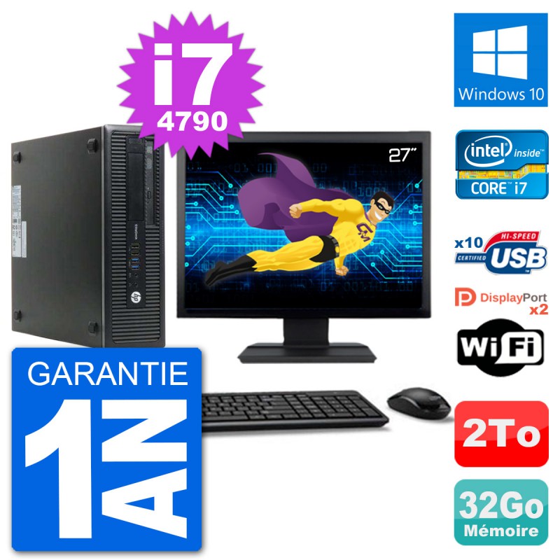 PC HP EliteDesk 800 G1 SFF - Intel Core i7-4790 3.6 Ghz (8 Mo) - 32 Go DDR3 - Disque Dur 3,5" 2 To - Graveur DVD - Clef Wifi USB - Windows 10 - Livré avec Ecran 27" + clavier + souris (Marques et modèles variables) - Garantie 1 an.