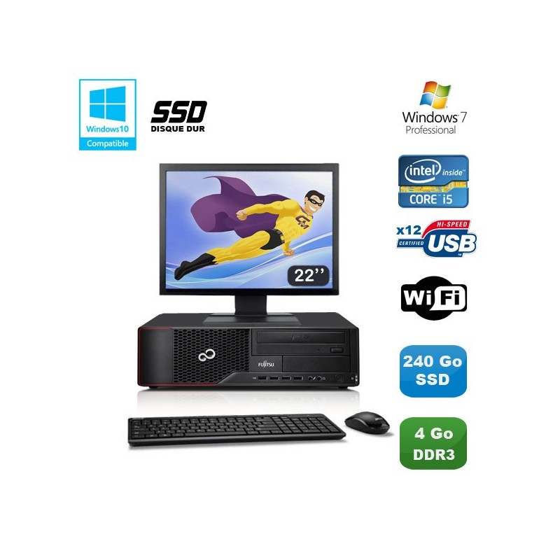 Lot PC Fujitsu Esprimo E700 E90+ SFF - i5-2400 3.1GHz (Turbo 3.4Ghz) - 4 Coeurs (4 Threads) - 4 Go DDR3 - 240Go SSD - Graveur DVD - Clé WIFI USB - Windows 7 Pro - Pack Écran 22"/Clavier/Souris (Marques et modèles selon arrivages) - Garantie 6 mois.