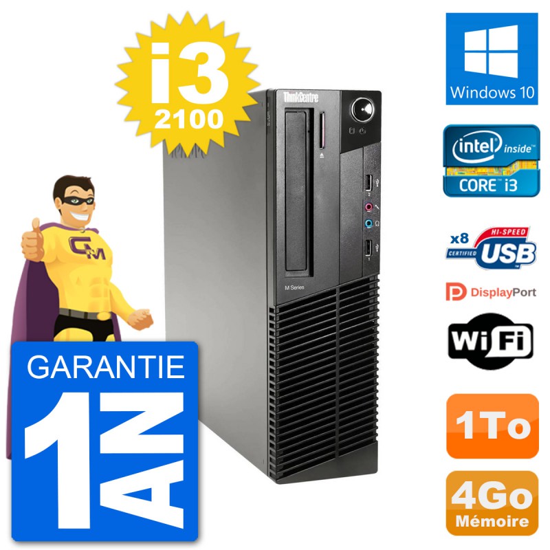 PC Lenovo ThinkCentre M91p SFF - Intel Core i3-2100 3.1 Ghz (3 Mo) - 4 Go DDR3 - Disque Dur 3,5" 1 To - Graveur DVD - Clef Wifi USB - Windows 10 - Garantie 1 an.